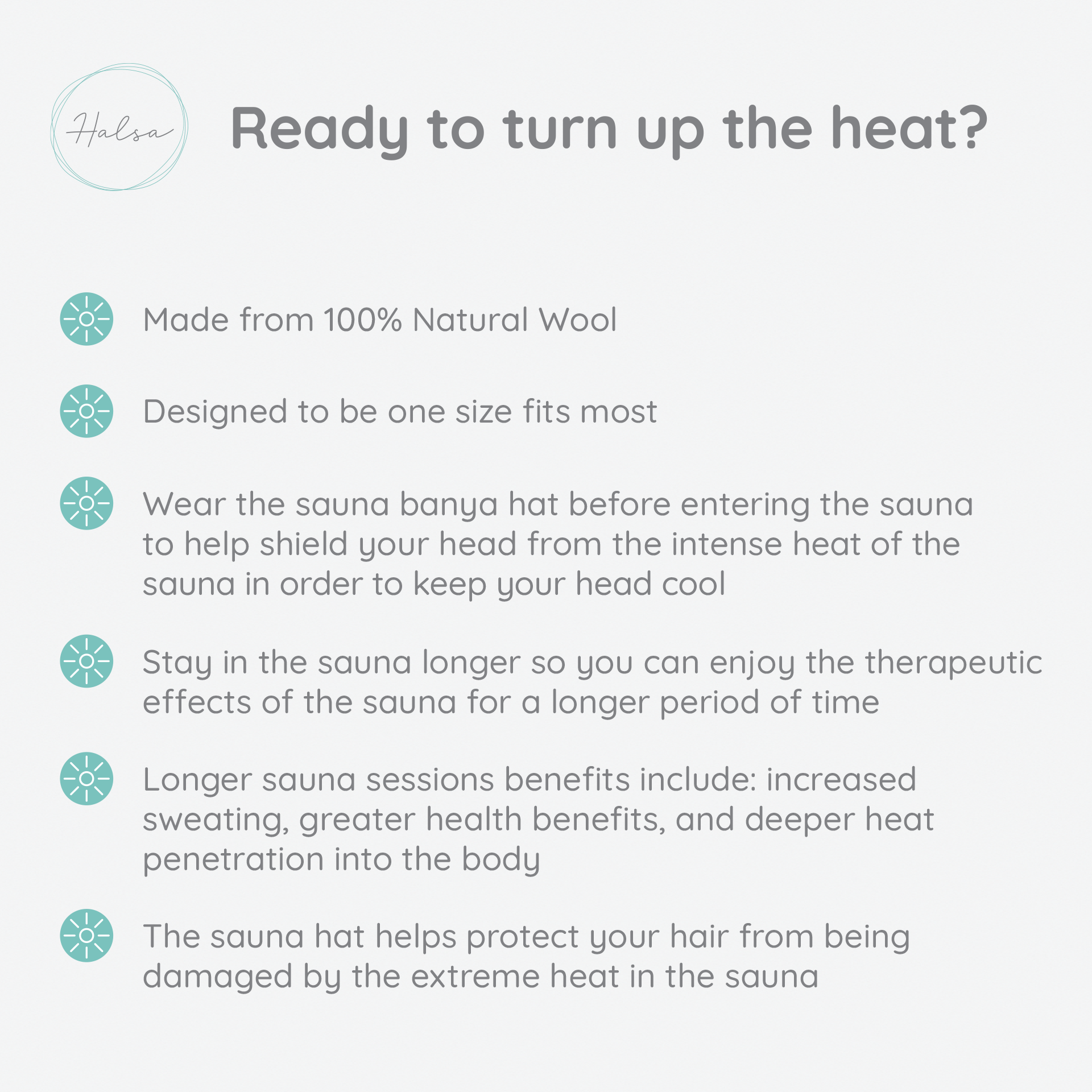 Elevate your sauna experience with the Halsa Wool Sauna Hat, crafted from 100% natural wool to deliver comfort, protection, and style. Designed to shield your head from intense sauna heat, this hat keeps you cool, allowing you to enjoy longer sessions and maximize the therapeutic benefits of deeper heat penetration and increased sweating. Soak it in cool water for an enhanced cooling effect as the water evaporates, ensuring lasting comfort.